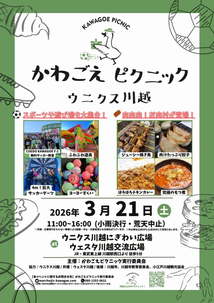 開催日程 2026年3月21日(土)11:00~16:00(予備日なし、雨天決行・荒天中止)11時~16時にウニクス川越に人気の飲食店やワークショップが約30店舗集結!