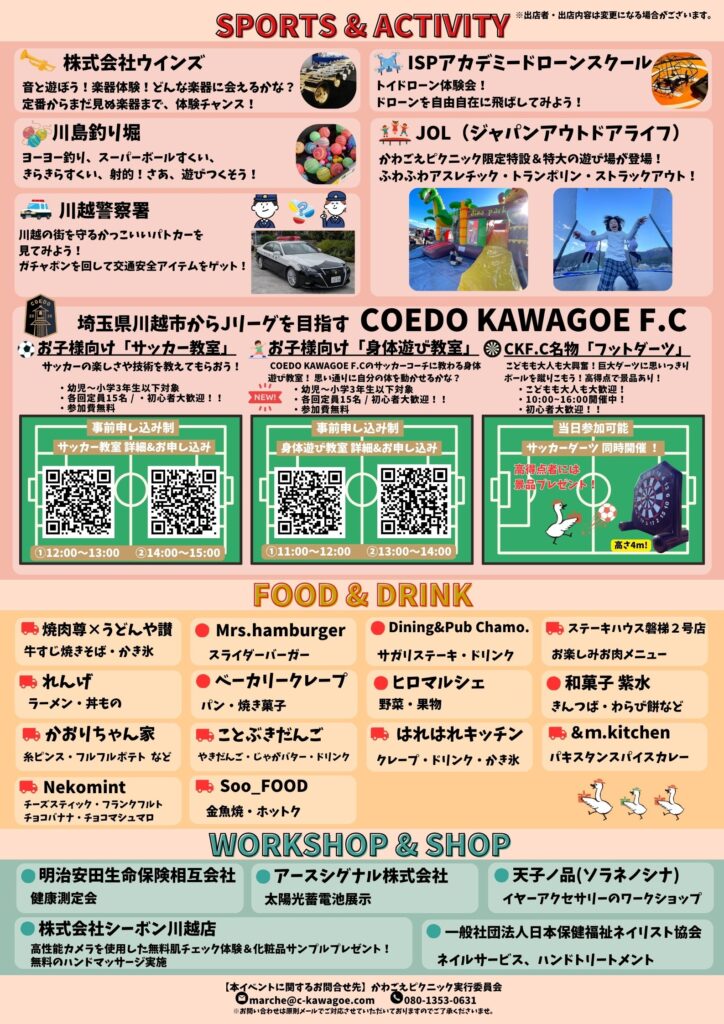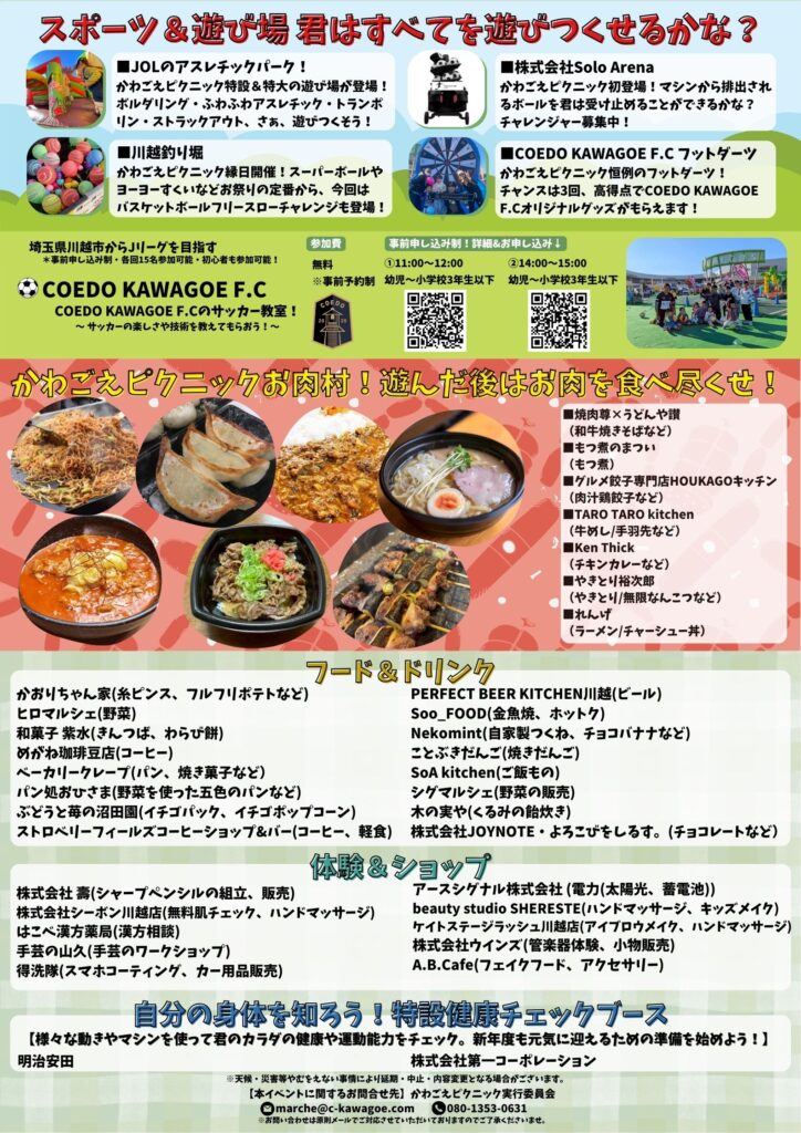 川越からJリーグを目指すCOEDO KAWAGOE F.C所属の元Jリーガーが指導する小学生の子ども向けサッカー教室やワークショップを開くなど、子どもからお年寄りまで幅広い世代が楽しめるコンテンツを用意してお待ちしております!