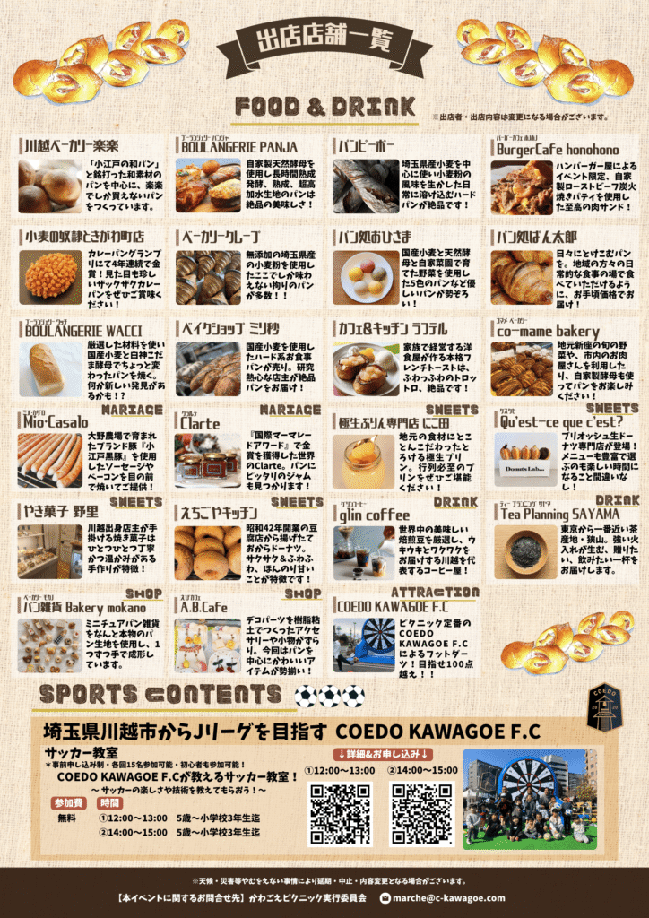 今回は、昨年の5月開催に引き続き、川越パンマルシェ様とのコラボイベントとして、パンマルシェを開催いたします!川越を中心に埼玉県内の魅力的なパン屋さんやスイーツ屋さんも多数出店!川越パンマルシェ様による特別ブースや、COEDO KAWAGOE F.Cの恒例無料サッカー教室やフットダーツも展開予定!